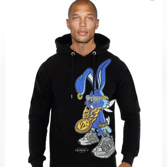 Stylish George V hoodie featuring a bold rhinestone graphic on a crisp background. Perfect for casual outings.